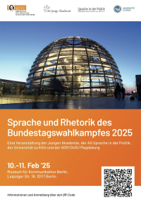 In dieser Ausgangslage veranstalten Mitglieder der AG Sprache der Jungen Akademie mit der „AG Sprache in der Politik" und der "Arbeitsstelle für linguistische Gesellschaftsforschung" diese interdisziplinäre Tagung, die einerseits den Fokus auf Sprache und Rhetorik richtet, aber andererseits auch den gesellschaftlichen, politischen und medialen Kontext zum Thema bietet.
